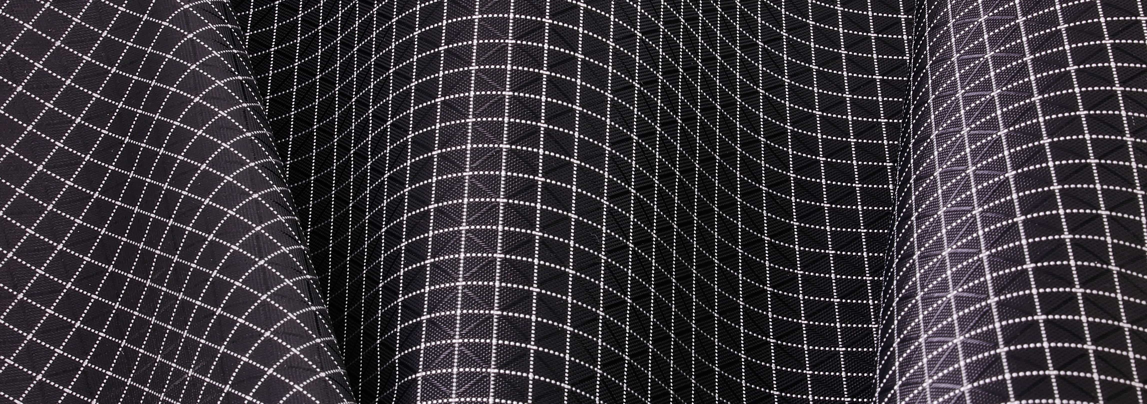 Es ist ein spezielles 210 Denier Ripstop-Nylon, in das zusätzlich Dyneema-Fasern eingewebt sind, um diese typische Gitterstruktur zu erzeugen. Kombiniert mit einer Polyurethan-Beschichtung wird es sehr wasserabweisend und behält gleichzeitig einen weichen, seidenartigen Griff.